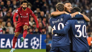 El futbolista del Liverpool Mohamed Salah (izquierda) y los jugadores del PSG Neymar Jr, Kylian Mbappé y Leo Messi.