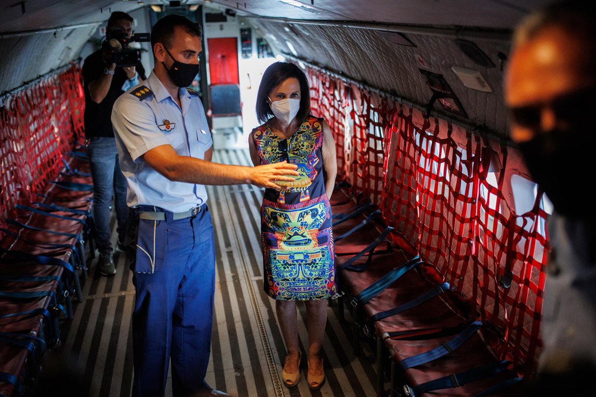 El capitán Robles conversa con la ministra de Defensa, Margarita Robles, durante una visita al ALA 35 del Ejército del Aire y del Espacio, en la Base Aérea de Getafe, a 23 de agosto de 2022, en Getafe, Madrid (España). Getafe inició su vinculación con l - Alejandro Martínez Vélez - Europa Press