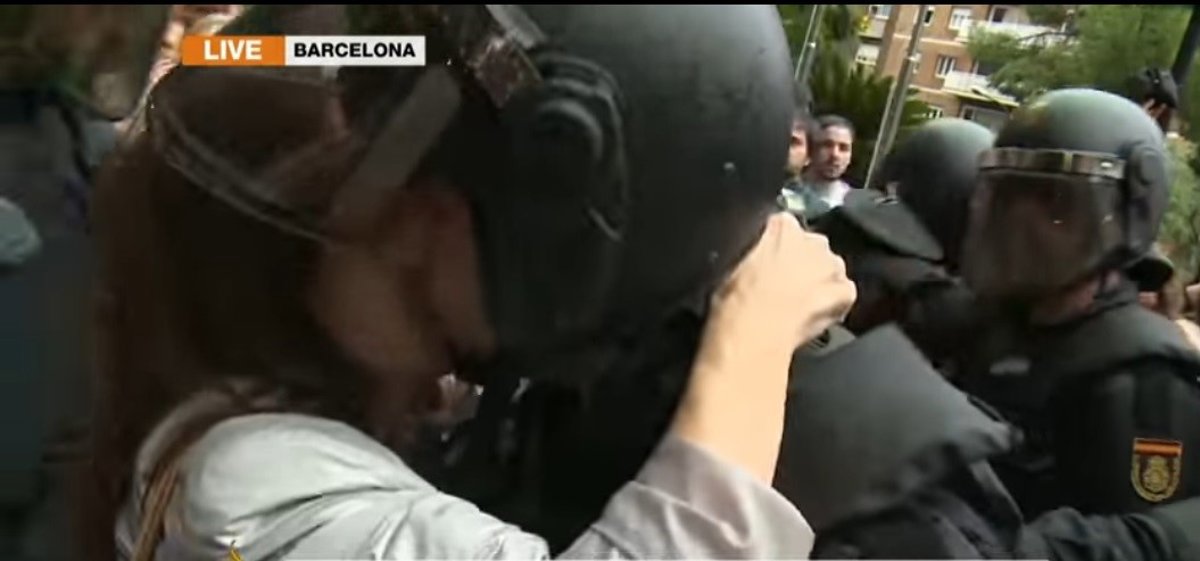 Los hechos ocurrieron en la calle Vía Augusta frente a los Servicios Centrales del Departamento de Enseñanza, usado como colegio electoral, como se puede observar en un vídeo que se adjunta en la demanda que pide identificar a la manifestante que, en un momento determinado, besa al policía, aprovechando que tenía levantada la visera de protección de su casco.