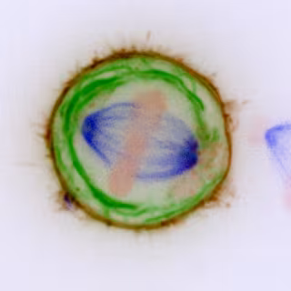 Los cromosomas (mostrados en rosa) son compartidos por el huso (azul). Las membranas (verde) son un factor de riesgo para el correcto reparto de los cromosomas.