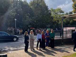 Momentos antes de la llegada de la monarca, los alumnos estaban expectantes en el patio y portaban una bandera de España. Además, de la verja colgaba una pancarta en la que se leía 'Bienvenida. IES Dr. Zapatero Domínguez'.