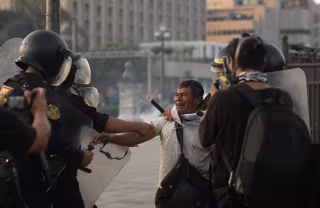Archivo - Agentes de la Policía y un manifestante en una protesta antigubernamental en Perú