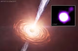 La imagen principal es una ilustración artística que muestra material en un disco que cae hacia un agujero negro supermasivo. Un chorro se aleja del agujero negro hacia la esquina superior derecha, como detectó Chandra en el nuevo estudio. El agujero negro se encuentra a 11.600 millones de años luz de la Tierra cuando el fondo cósmico de microondas (CMB), el resplandor residual del Big Bang, era mucho más denso que ahora, informa la NASA.
